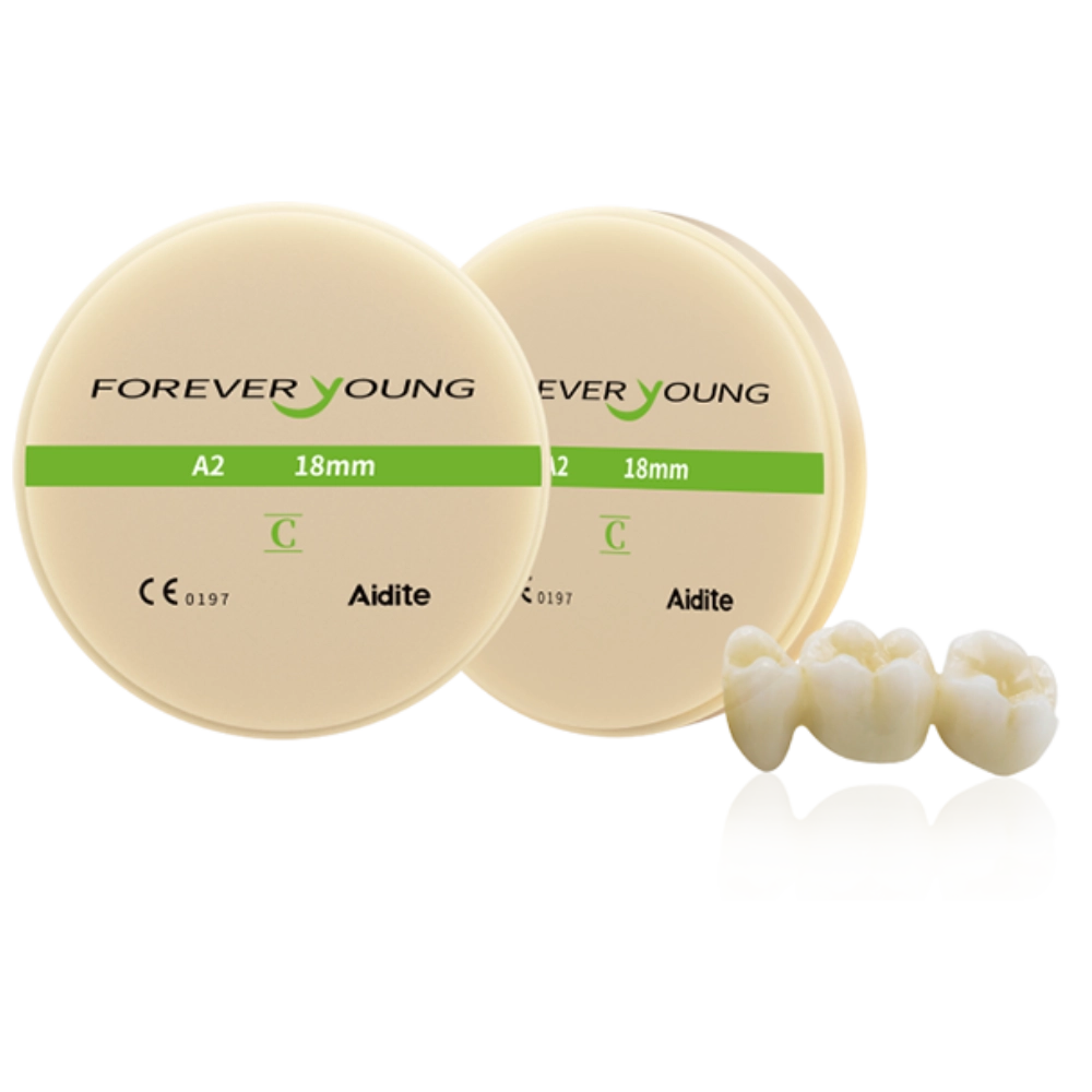 Le disque PMMA monoshade d’Aidite se distingue par sa densité exceptionnelle et sa régularité chromatique. contrairement aux versions multicouches, ce disque présente une seule teinte parfaitement uniforme dans toute sa masse, ce qui en fait le choix privilégié pour les couronnes postérieures, les bridges de longue durée ou les maquettes d’essayage (wax-up usinés).