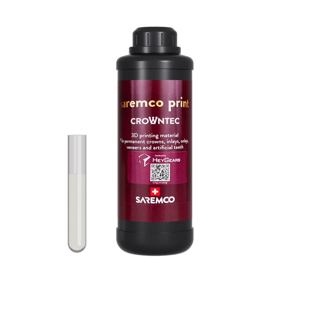 La résine Saremco CROWNTEC UltraPrint-Dental LT Crown UV pour HeyGears est une résine biocompatible spécialement conçue pour la fabrication de couronnes et de bridges durables. Elle contient des charges céramiques et possède des propriétés mécaniques exceptionnelles, avec une résistance à la flexion supérieure à 138 MPa. Le modèle imprimé présente une excellente stabilité dimensionnelle et une adaptation parfaite des bords.