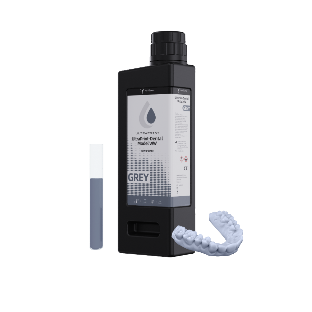La résine UltraPrint-Dental Model WW d’HeyGears est une résine d’impression 3D lavable à l’eau de 405 nm conçue pour la production de modèles dentaires. Les modèles dentaires imprimés peuvent être nettoyés à l’eau pour éliminer tout résidu de résine à la surface. Ce matériau se caractérise par une vitesse de formation rapide et une grande précision. Grâce à son excellente reproduction des détails, à la stabilité dimensionnelle de ses marges et à sa bonne résistance à la chaleur, le modèle WW est capable de répondre aux exigences de production d’une grande variété d’applications dentaires. Sa faible viscosité permet de minimiser la consommation de matériau et facilite le nettoyage.