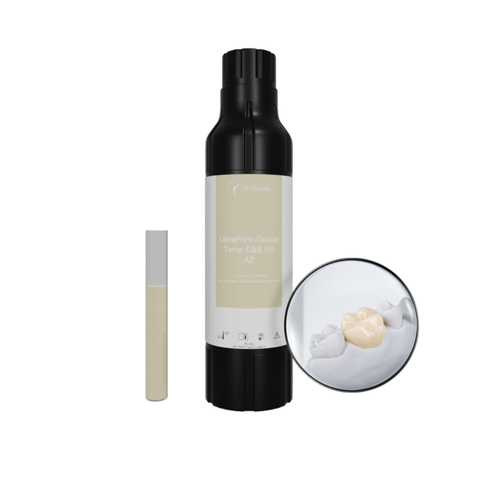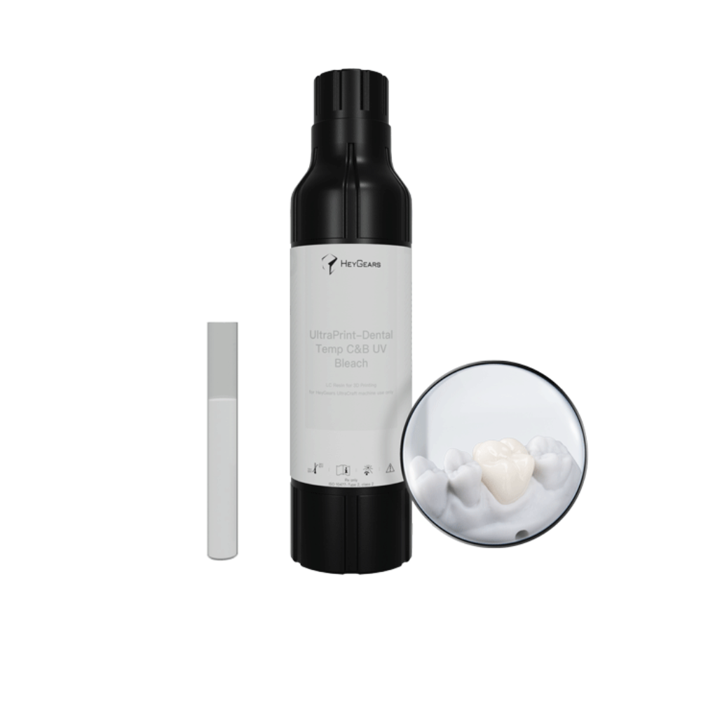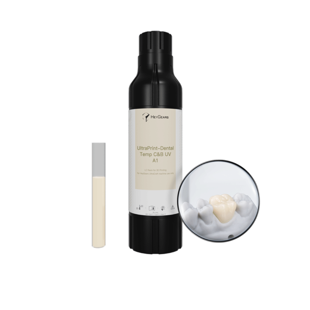 La résine UltraPrint-Dental Temp for Try-in UV d’HeyGears est un matériau biocompatible développé pour la fabrication de couronnes et de bridges provisoires. Ce matériau offre une meilleure résistance à la pression et aux chocs, à l’usure et à la corrosion, ce qui permet une excellente adaptation marginale et une grande stabilité dimensionnelle. Il offre également un plus large choix de teintes pour une esthétique dentaire naturelle et conserve une grande stabilité chromatique même en cas de corrosion. Il est inodore, peut être utilisé en intra-oral pendant de longues périodes et est visible sur les scans CBCT.